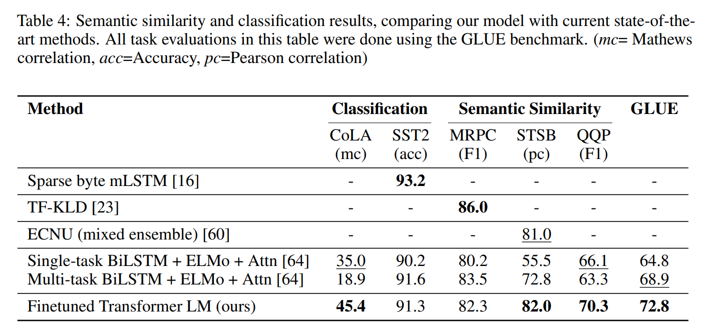 - 추가로, transformer 구조 대신 LSTM 모델을 사용했을 때 MRPC 데이터 셋을 제외하고는 모두 transformer보다 낮은 성능 기록