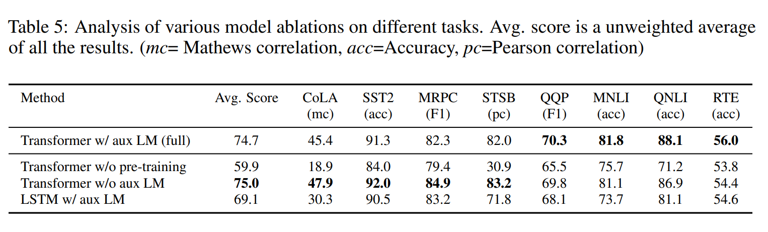 - 보조 학습 목표가 성능 향상에 도움을 줄 수 있지만, 비지도 사전 학습(Unsupervised Pre-training)만으로도 충분한 언어적 정보를 학습하고 목표 작업을 효과적으로 수행할 수 있음을 입증