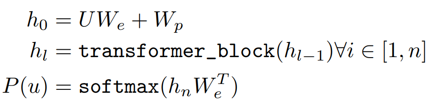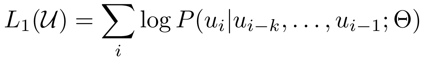- unsupervised 말뭉치 U = {u1, . . . , un}가 주지면 standard LM 목표를 사용하여 아래와 같은 likelihood 최대화