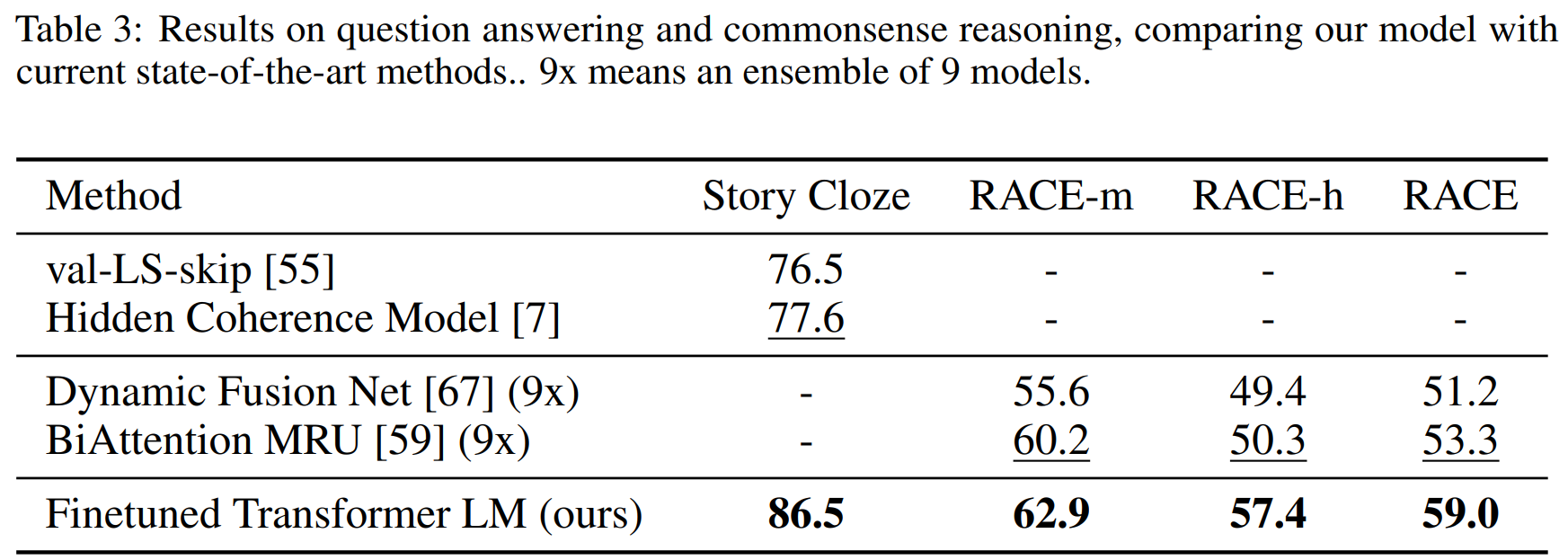 - 문서 분류, 문장 간 유사성 평가, 질의 응답, 문맥적 함의 추론 등 다양한 분야에서 성공적으로 fine-tuning이 이루어졌으며 12개 중 9개 task에서 SOTA 달성