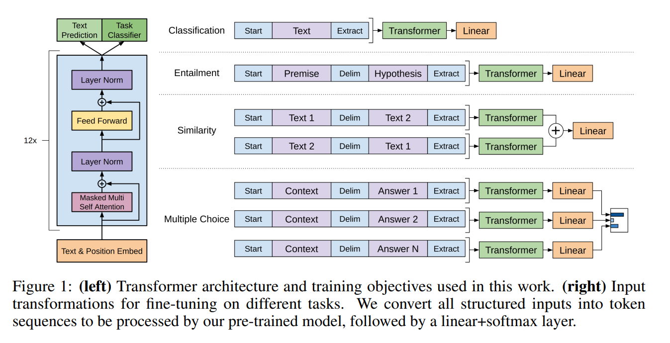 - GPT-1의 traversal-style approach은 복잡한 구조를 가진 input(문장 쌍, 문서-질문-답변 등)을 단순한 텍스트 시퀀스로 변환하여 transfer learning을 최소한의 변화로 가능하게 함