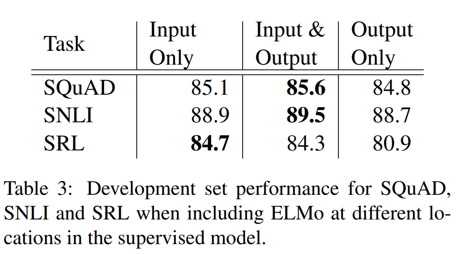 - output layer에서 ELMo 적용 시 SQuAD, SNLI task에서 성능 향상을 보임