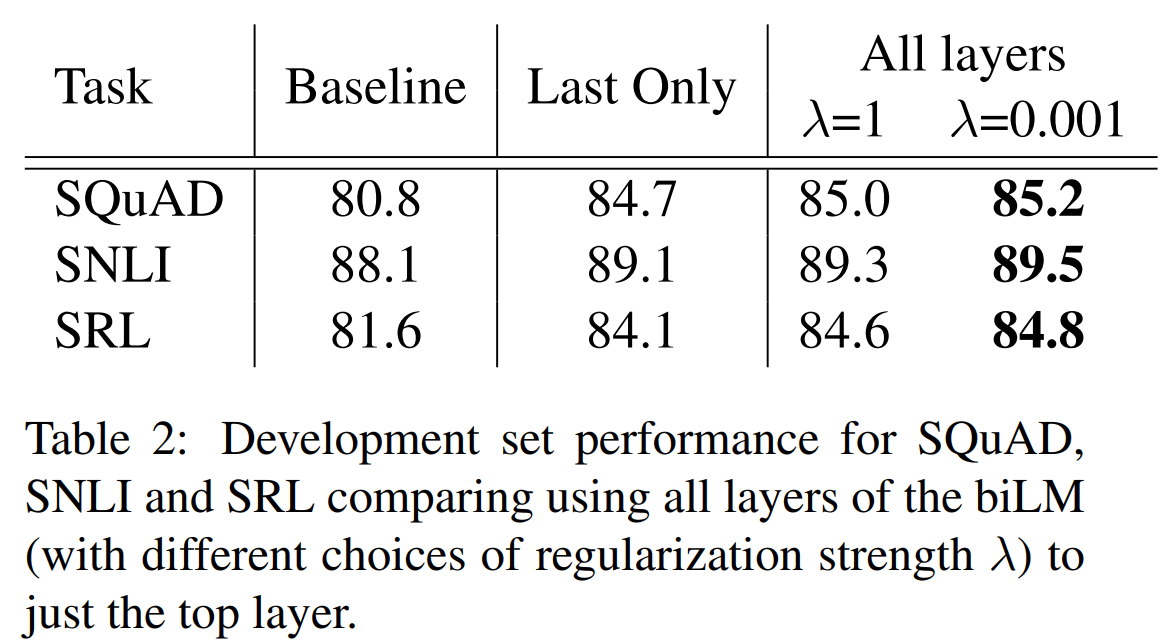 - BiLM의 마지막 layer를 사용하는 것보다 모든 layer를 사용하는 것이 더 좋음
