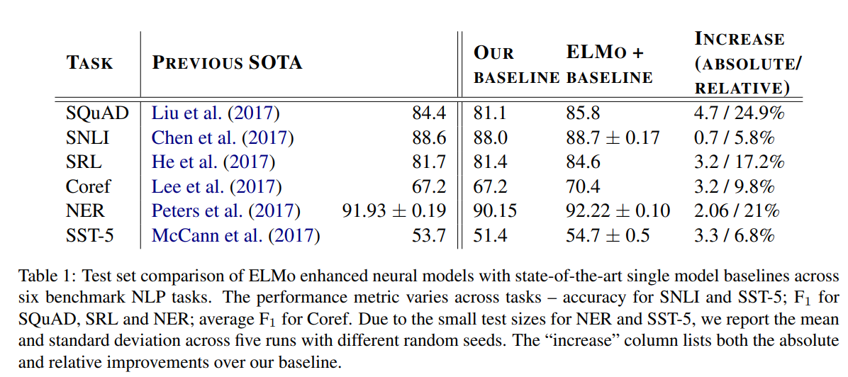 - 6개의 NLP downtask에 대하여 단지 ELMo을 추가하는 것만으로도 SOTA보다 좋은 성능을 이끌어냄