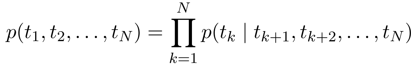 - 각 토큰 의 확률을 이전 토큰들의 히스토리 에 기반하여 모델링