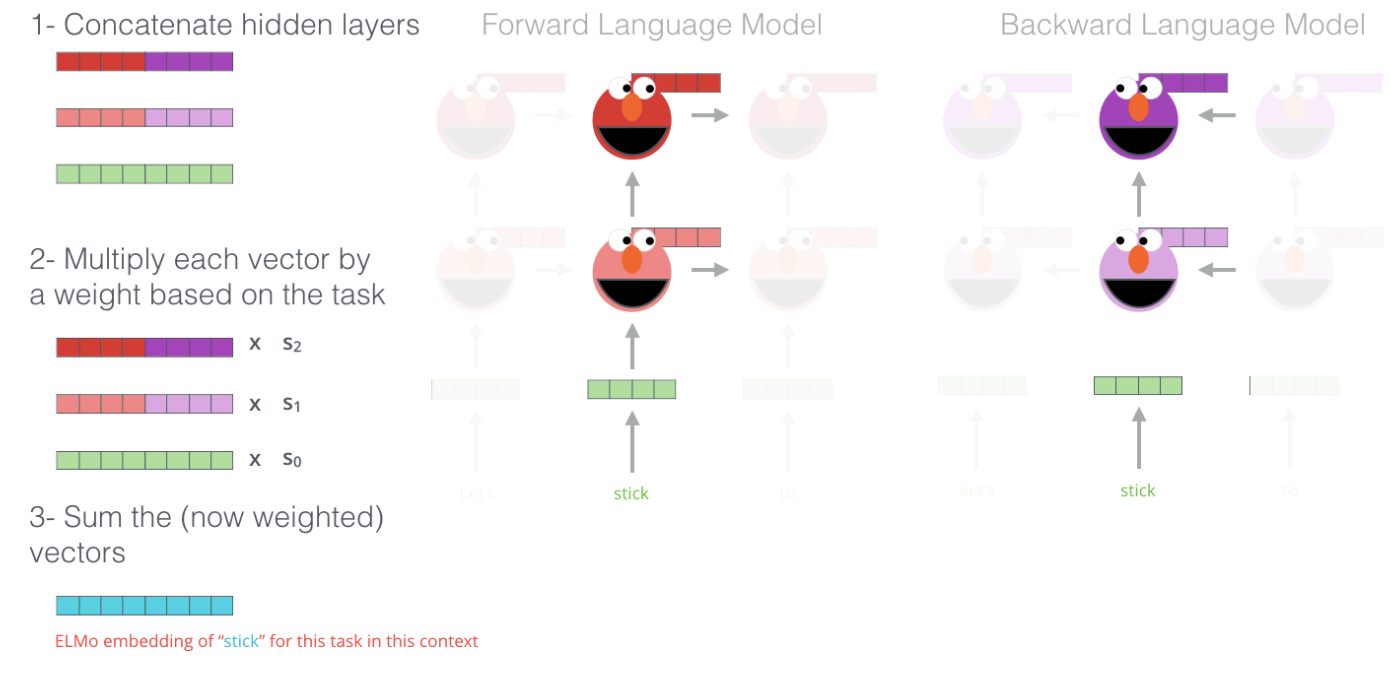 - 다운스트림 작업에 사용될 때는 ELMo 가중치를 고정한 채로 추가적인 모델을 학습
