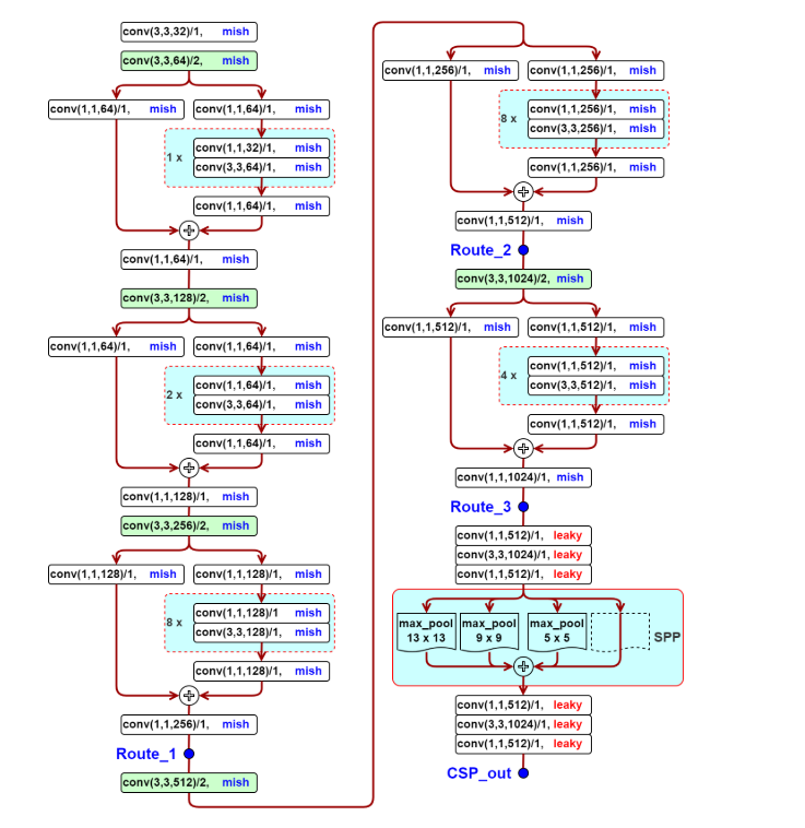 - CSPDarknet53: 분류와 탐지 모두에 적합, 탐지 성능 최적