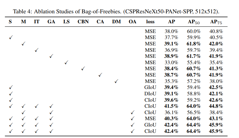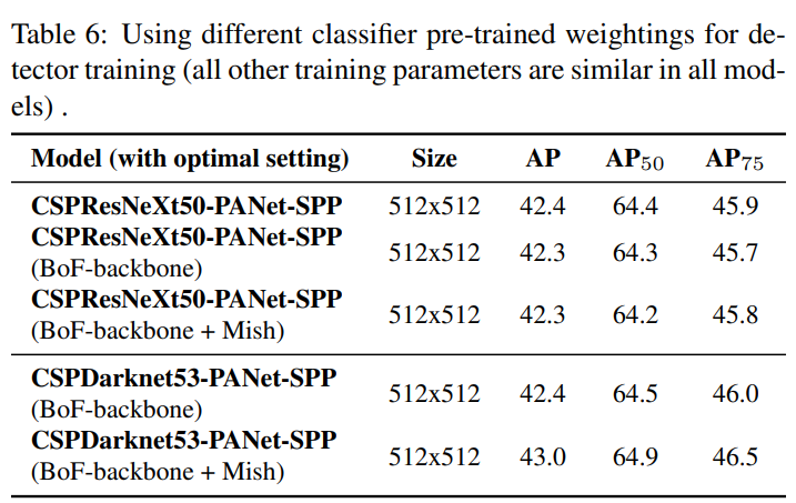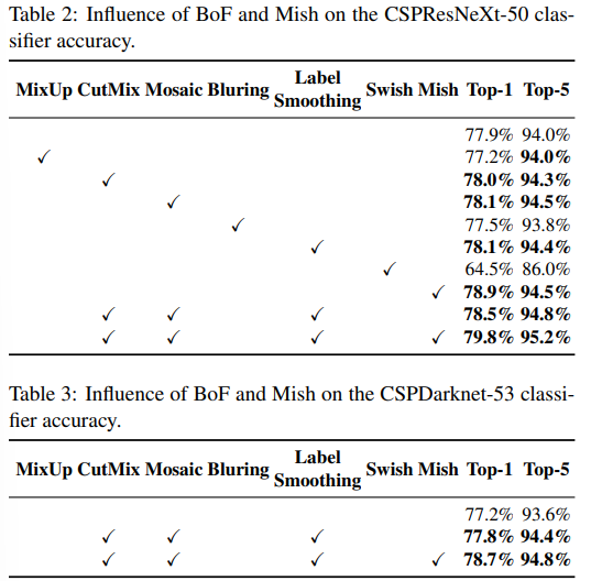 - Classifier 학습에서 사용하는 BoF는 Cutmix + Mosaic + Label Smoothing