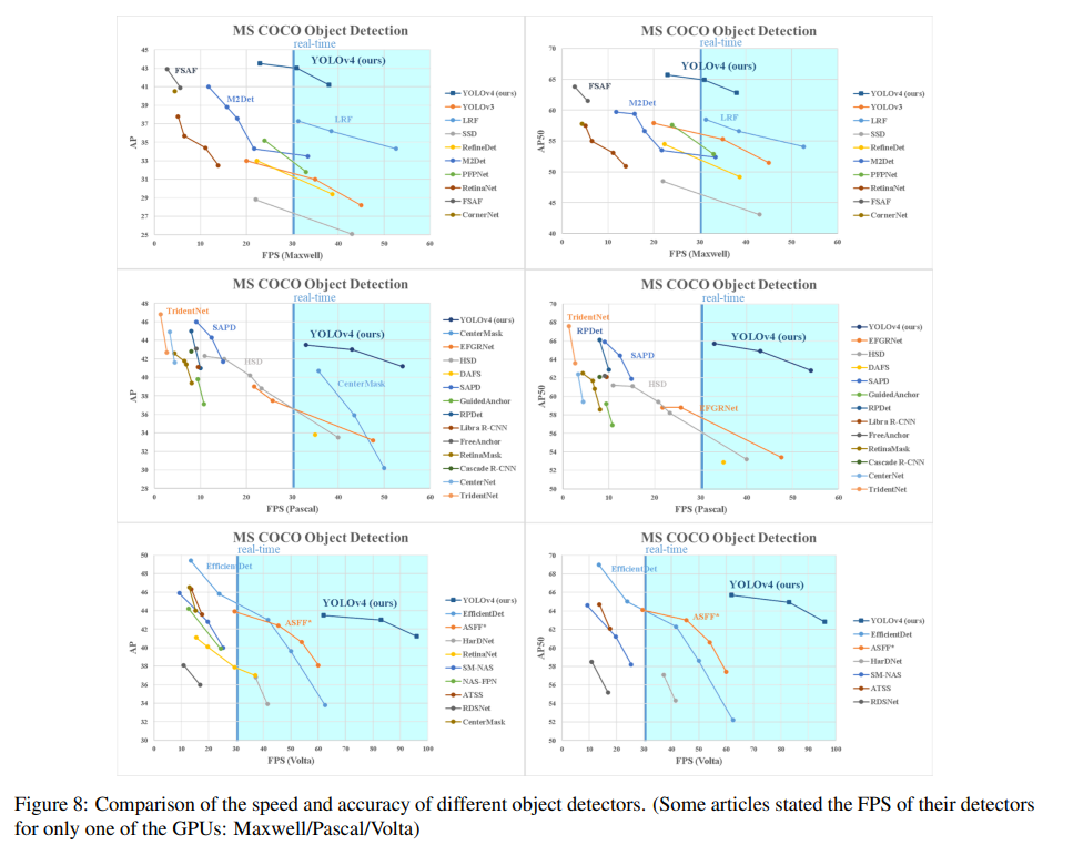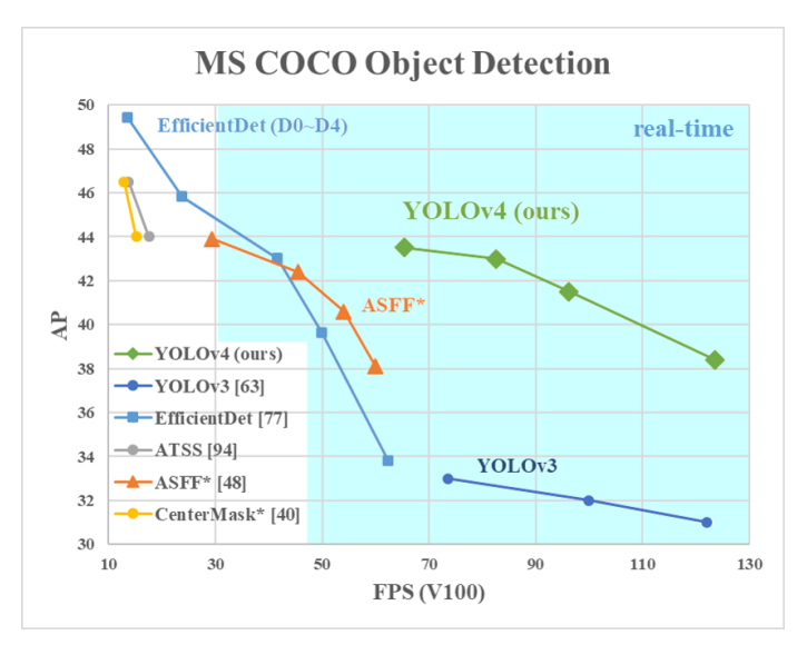 - YOLOv4는 다른 모델보다 오른쪽 위에 있음